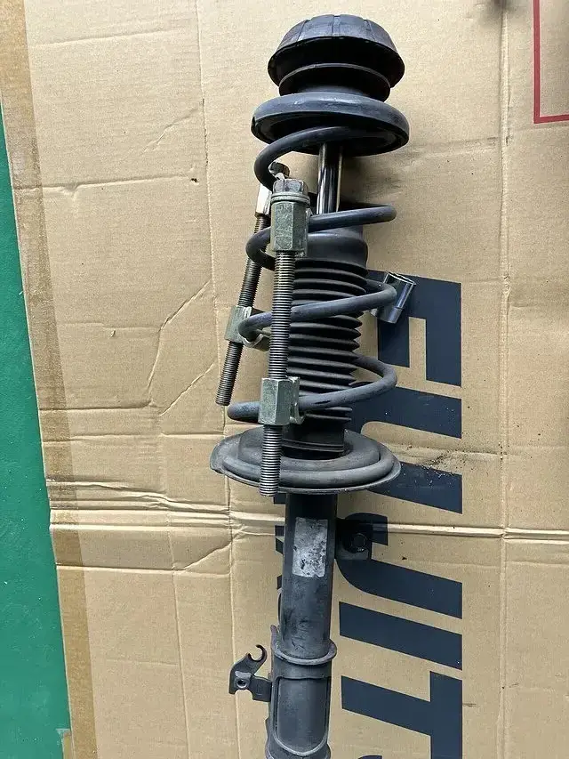 スプリングコンプレッサーを使って、フロントを分解しているところです。