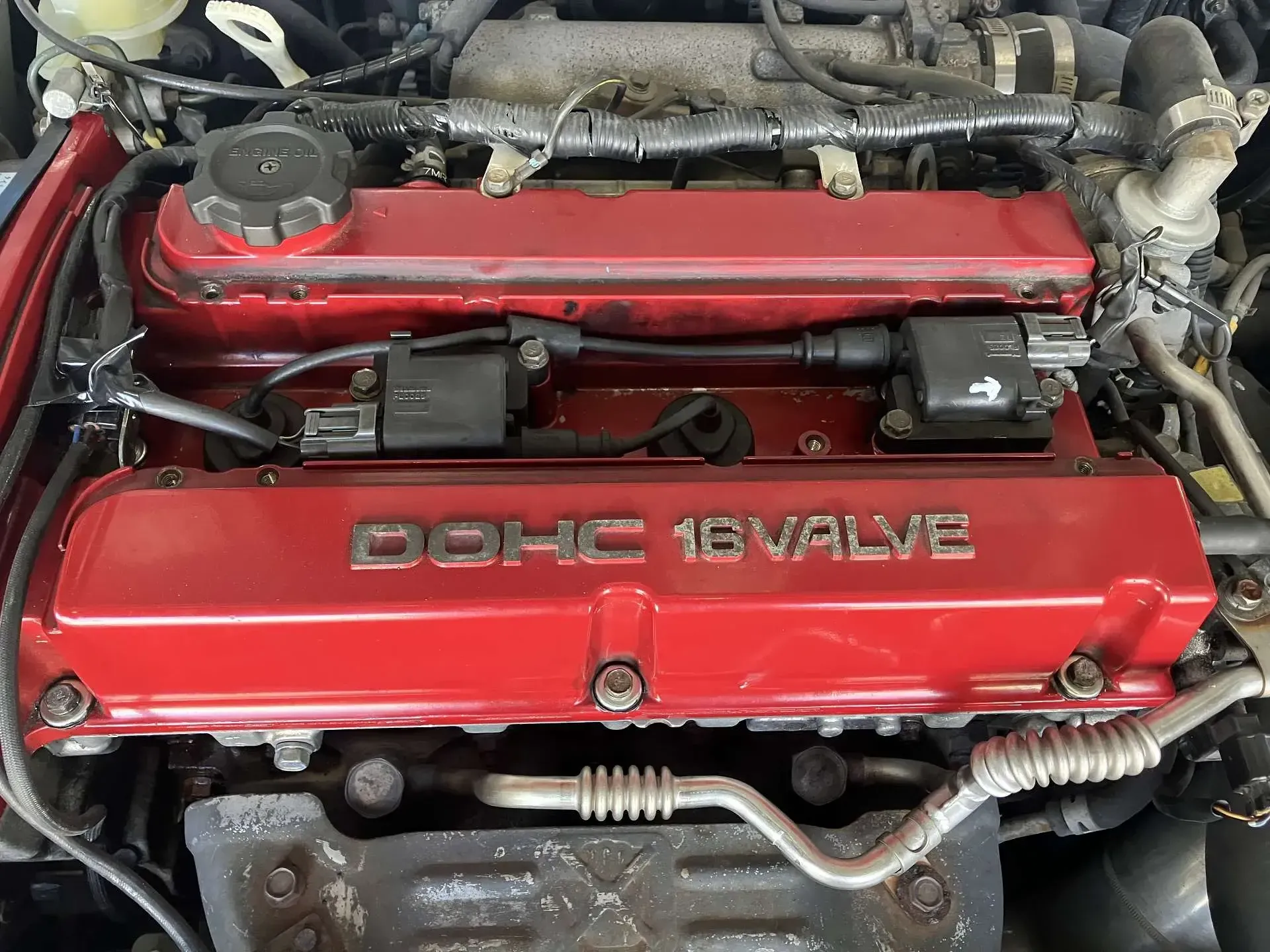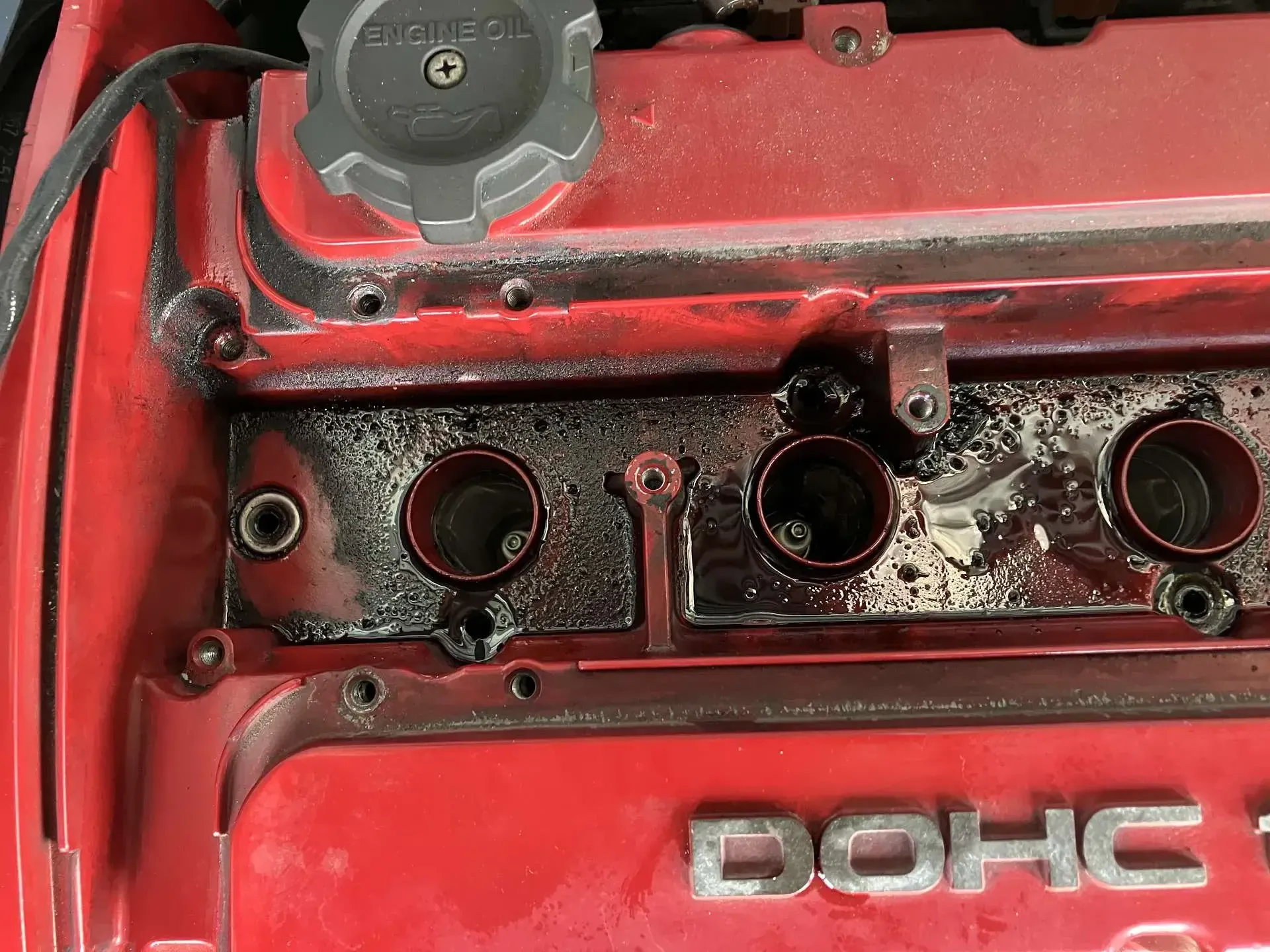 プラグカバーがついていて上からの判断はできていなかったのですが、エキマニ周辺までオイル漏れ、エンジン裏側にもオイル漏れがあったため、点検をしてみました。